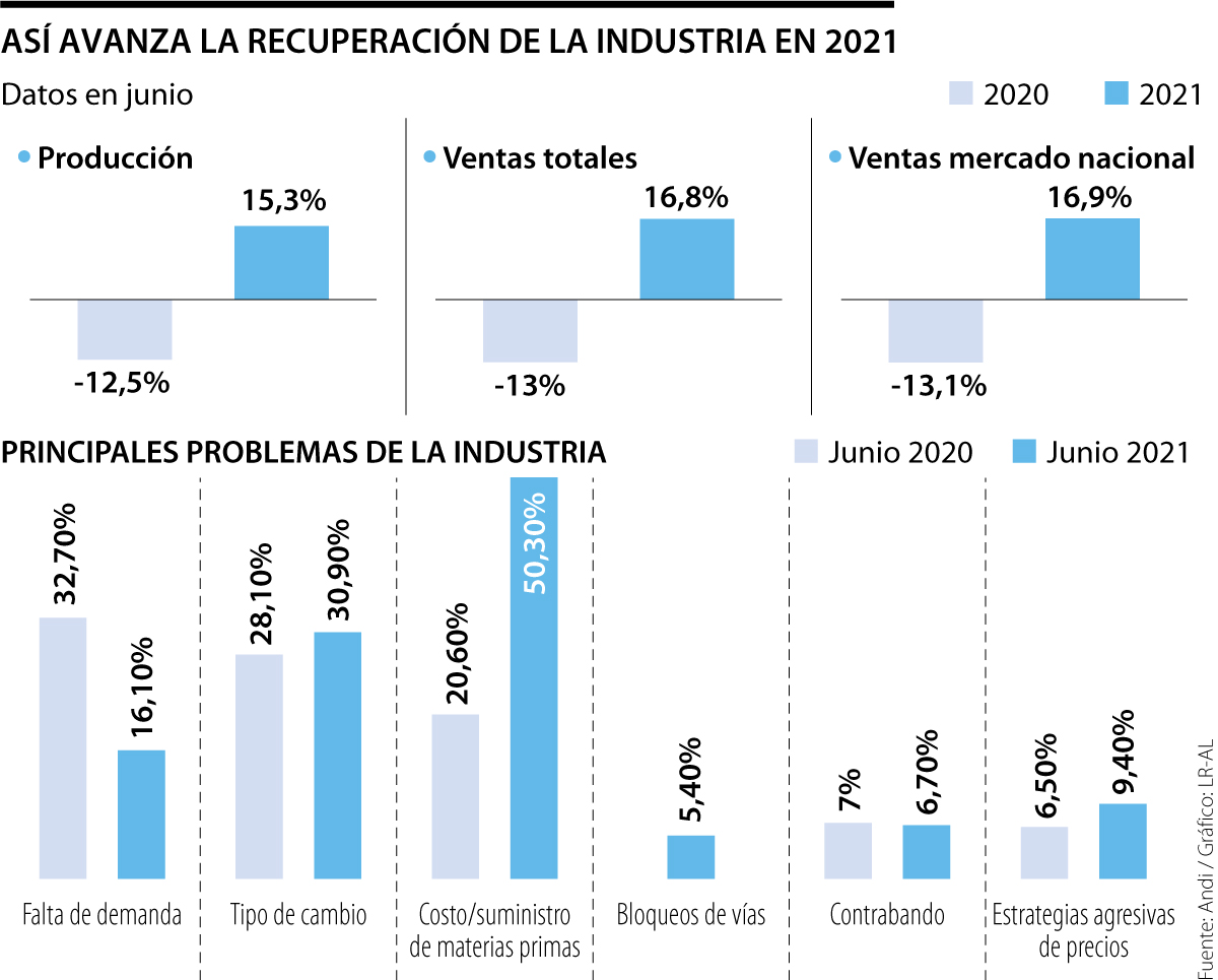 En la misma dirección, en la Encuesta de Opinión Industrial Conjunta en junio hubo un aumento de la producción manufacturera de 15,3%, panorama alentador frente a la caída de 12,5% para el mismo periodo de 2020. Por su parte, las ventas totales pasaron a 16,8% y las ventas para el mercado nacional aumentaron 16,9%.