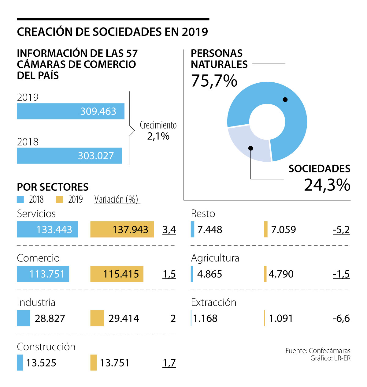 La recuperación económica que se vivió el año pasado se vio reflejada en las cifras de creación empresarial. En 2019 se registraron 309.463 compañías nuevas, 2,1% más que en 2018. A nivel general, las empresas del sector servicios fueron las que más aumentaron sus registros ante las Cámaras de Comercio, pues pasaron de 133.443 nuevas empresas en 2018 a 137.943 en 2019, lo que significó un incremento de 3,4%.