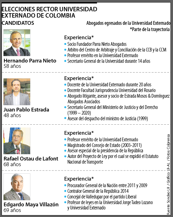 Los candidatos son Hernando Parra; Rafael Ostau de Lafont, ambos profesores eméritos de la Universidad; Juan Pablo Estrada, profesor de la Facultad de Derecho del Externado hace 20 años; y Edgardo Maya, exprocurador y excontralor, cuya postulación ha despertado críticas por su perfil político y no académico.