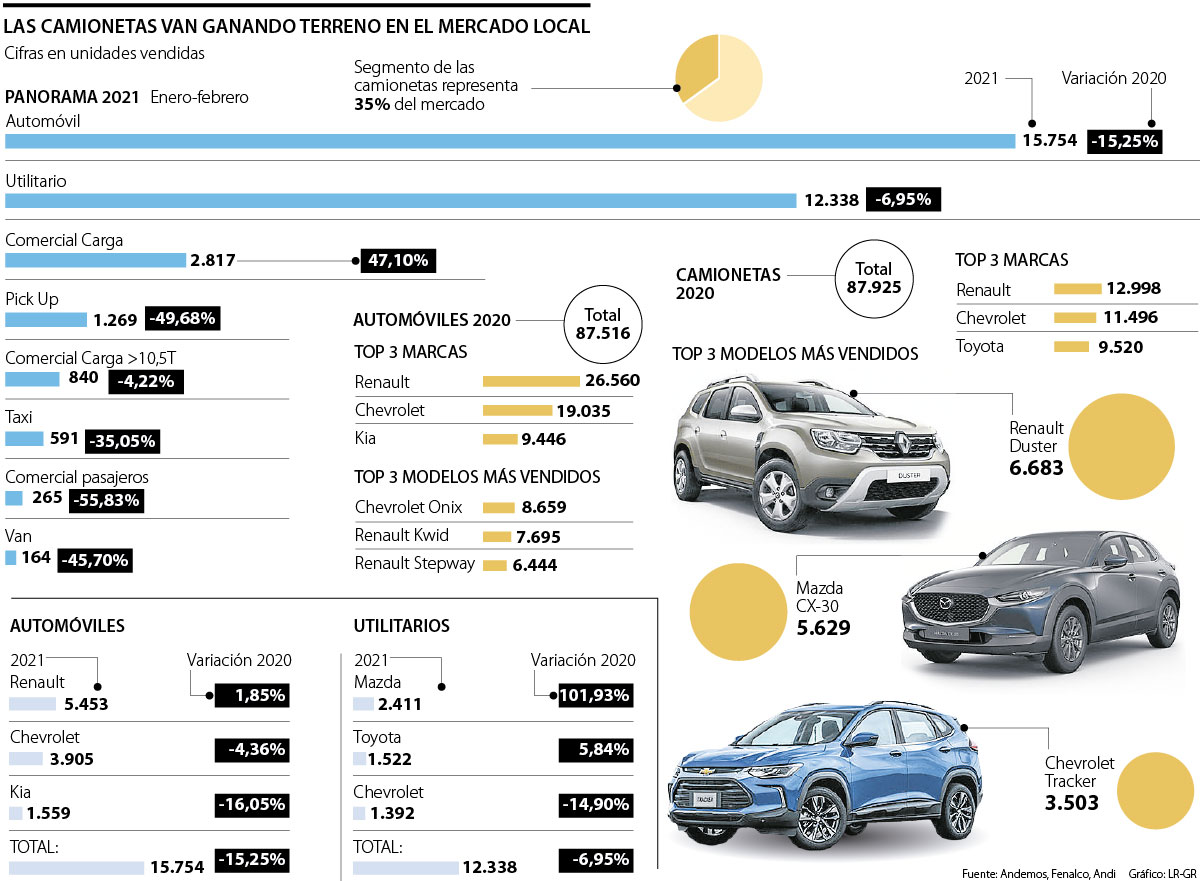 Al mirar solo el segmento de utilitarios, Mazda es el líder del mercado con 2.411 unidades y un crecimiento de 102%, seguida de Toyota, con 1.522 unidades y un incremento de 6%; y Chevrolet, que registra 1.392 unidades. Con lo que se han superado los niveles prepandemia, si se tiene en cuenta que en enero y febrero de 2020 no había llegado el virus al país.