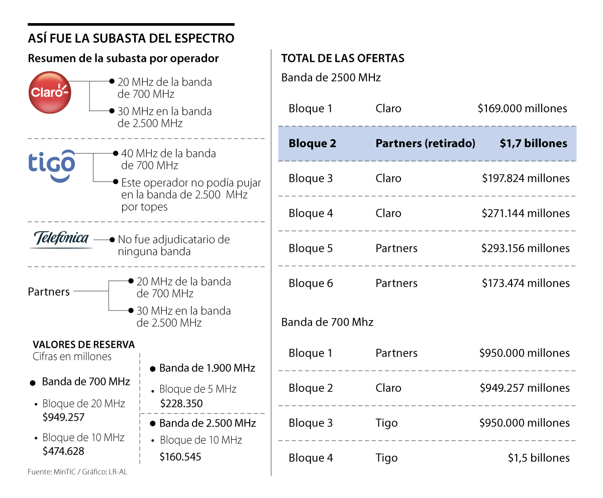 Además resaltó que en el caso de Telefónica la empresa se vio perjudicada. “Nos afectó porque al mirar cada una de las ofertas que hicimos, primero intentamos ir por la banda de 700 MHz, cuando vimos que era el momento de optar por la de 2.500 MHz, ya Partners había sido ganador en la segunda secuencia y si compro un bloque de 10 MHz, necesito tener capacidad de mínimo 30 MHz, es necesario ir por los otros dos bloques”.