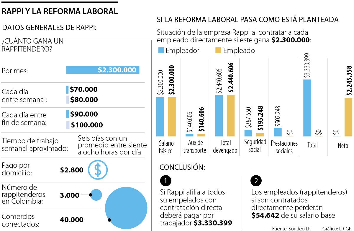 Si la reforma laboral llega a pasar como está actualmente planteada, Rappi deberá contratar directamente a cada empleado, garantizándole todos los beneficios de cualquier otro empleado. Si se toma como base dicho promedio, el empleador tendría que otorgar un auxilio de transporte, por $140.606; seguridad social, por $387.550; y prestaciones sociales, por $502.243. En total, cada domiciliario le costaría a la empresa $3,30 millones.