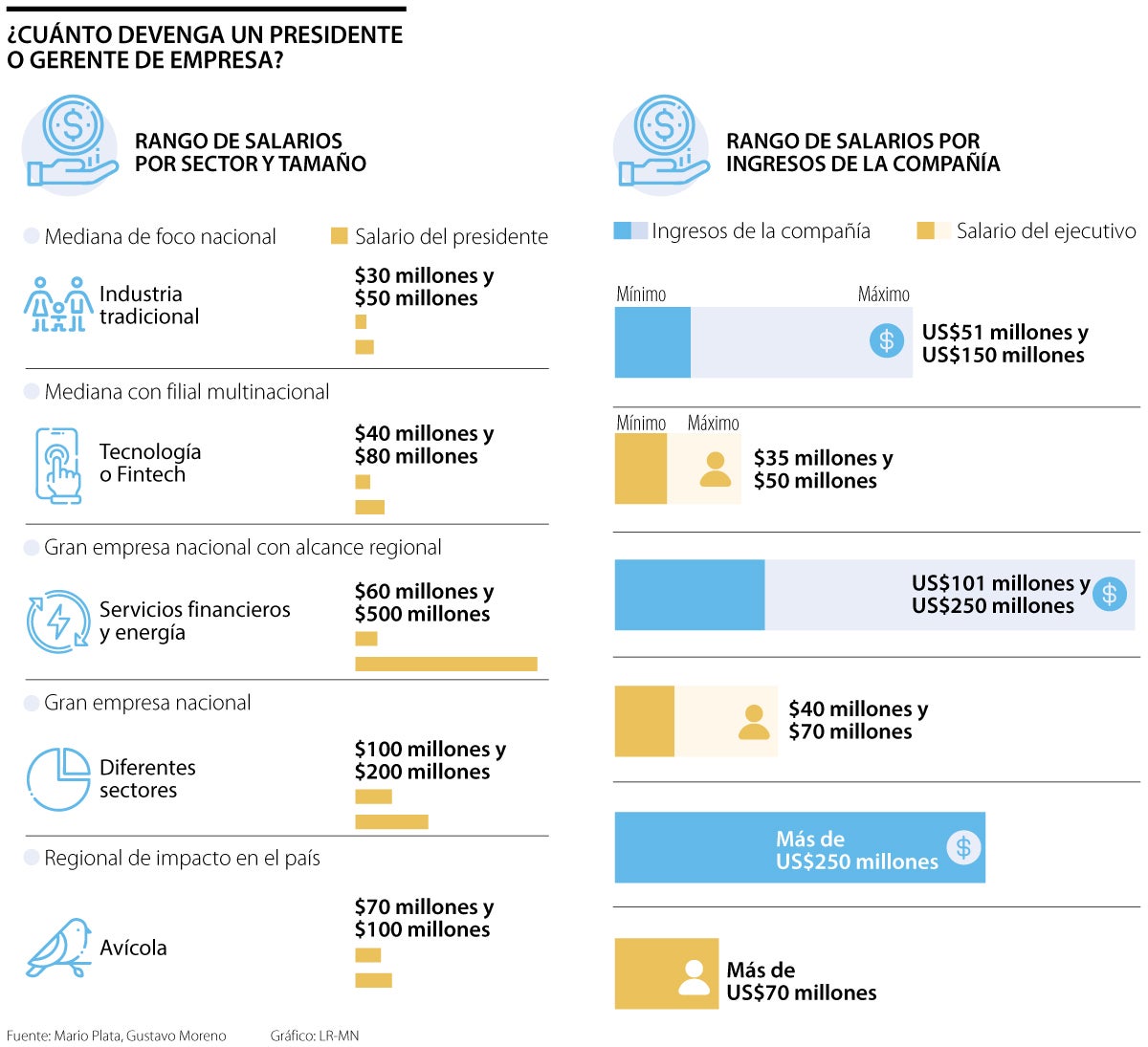 El tamaño de la empresa, la facturación anual, el sector, su razón social e impacto geográfico son algunos de los factores que determinan el salario de un presidente o gerente de empresa. Los rangos oscilan entre $30 millones y más de $200 millones, incluso algunos rondan los $500 millones.