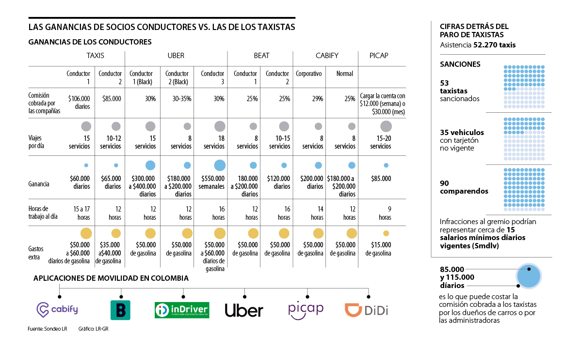 Una de las quejas de los conductores de taxi es que están en desventaja pues tiene más gastos que los conductores de estas aplicaciones, pues mientras un cupo para manejar taxi puede llegar a costar entre $70 millones y $85 millones, los más de 88.000 conductores de Uber, Cabify, DiDi, Beat, Picap e InDriver no tienen que pagar nada por inscribirse y trabajar con ellas. Además, las comisiones son mucho más bajas y las ganancias aumentan.
