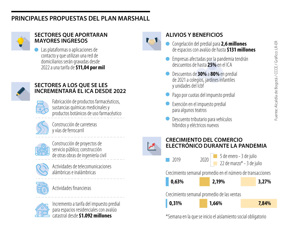 Para la reactivación de la economía, se plantea la congelación del predial para 2,6 millones de espacios con avalúos por debajo de $131 millones. Las empresas más afectadas por la pandemia tendrán descuentos de hasta 25% en el ICA; y habrá reducciones de entre 30% y 80% en predial de 2021 para colegios, jardines infantiles y unidades de servicio del Icbf.