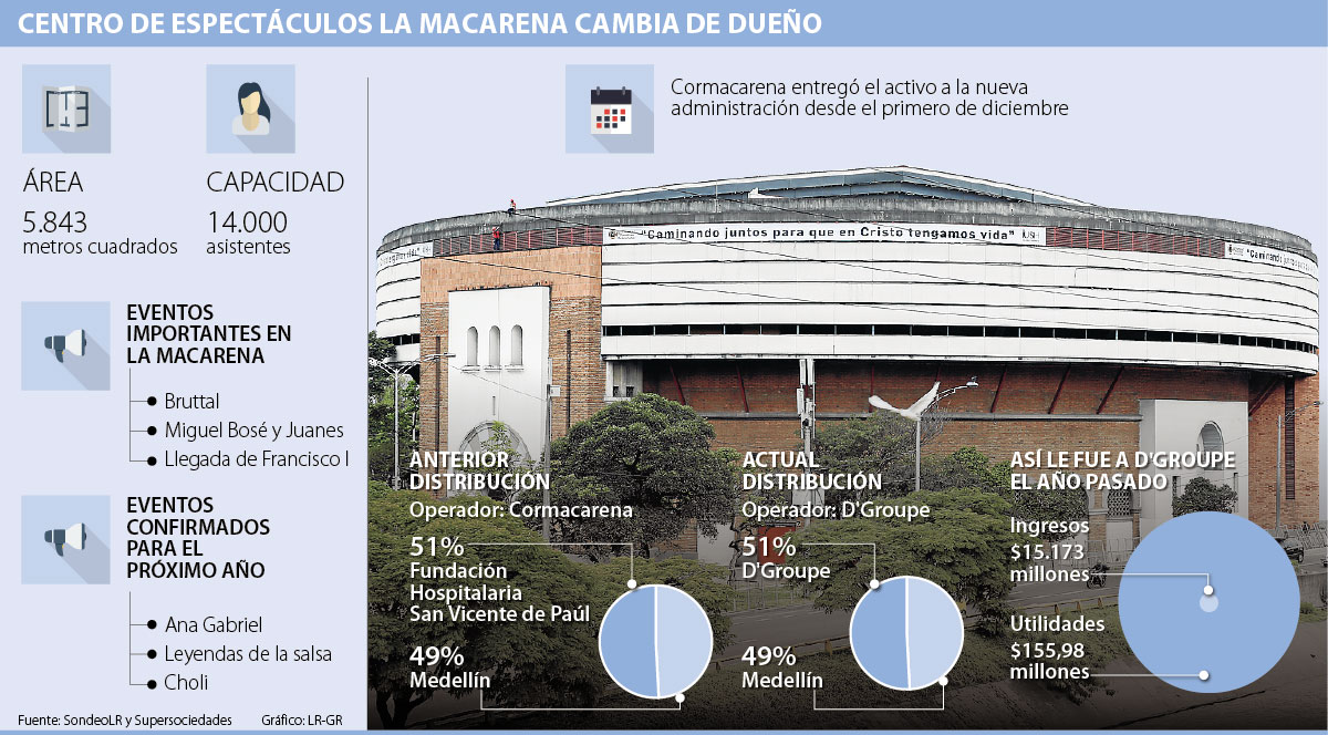 La cara de los espectáculos en Medellín, Antioquia, cambiará en los próximos meses por cuenta de una inversión que se acaba de concretar y que tiene como protagonista a la firma de eventos D’Groupe. La compañía que es reconocida por organizar shows como Bruuttal o la actividad Tierra, Mar y Aire en Cartagena, adquirió la participación que tenía la Fundación Hospitalaria San Vicente de Paúl (51%) en el Centro de Espectáculos La Macarena.