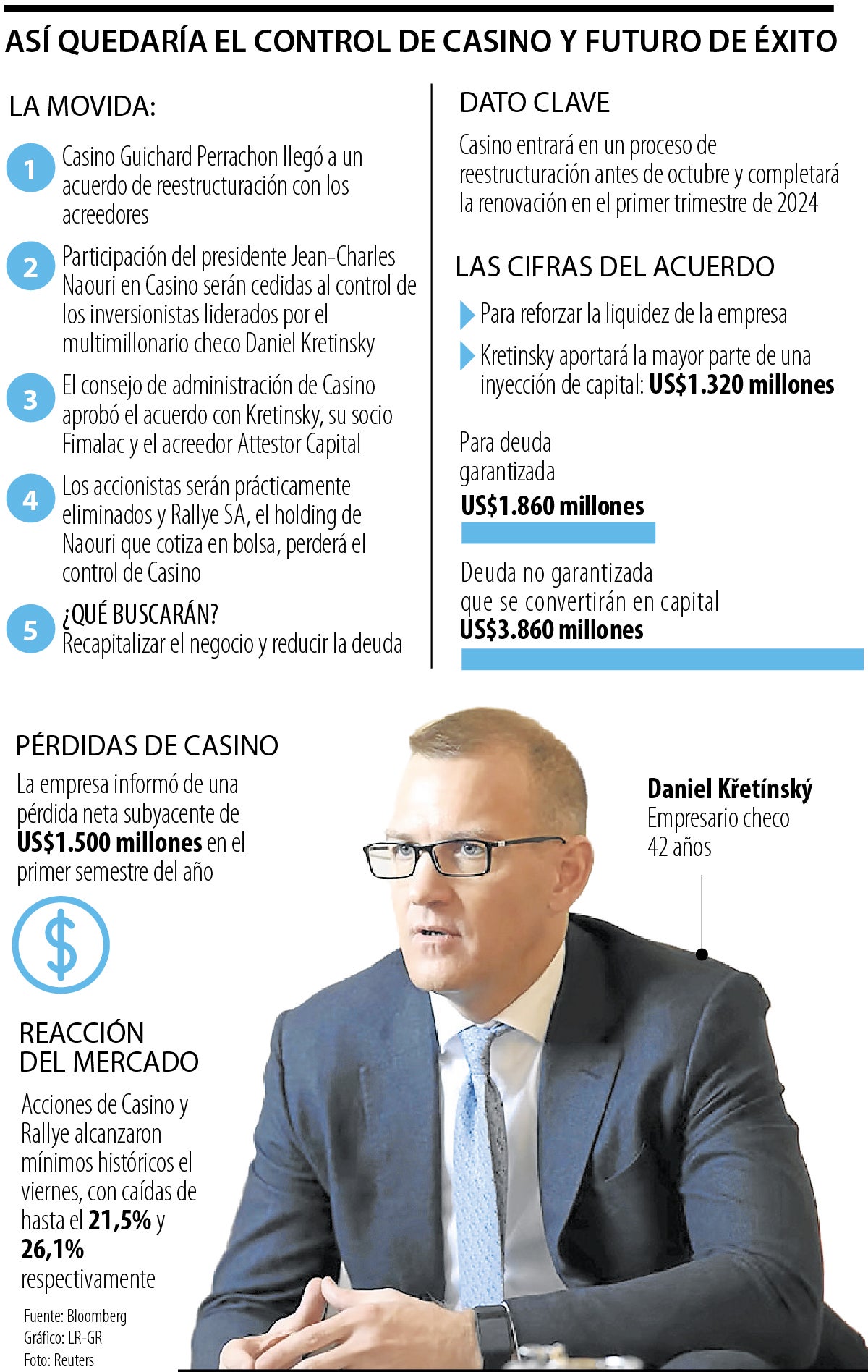 Křetínský aportará la mayor parte de una inyección de capital de US$1.320 millones para reforzar la liquidez de la empresa. Más de US$1.860 millones de deuda garantizada y US$3.860 millones de deuda no garantizada se convertirán en capital. Y es que el sexto minorista más grande de Francia fue llevado al borde de la cesación de pagos después de años de acuerdos alimentados por la deuda y recientes pérdidas en la participación de mercado ante grupos de supermercados rivales.
