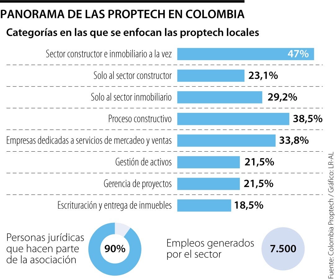 Según los datos de la Asociación Colombia Proptech, 47,7% de los afiliados y de las empresas de este sector impactan positivamente con sus productos y servicios tanto en el sector inmobiliario como constructor, 29,2% solo lo hace en el sector inmobiliario y 23,1% específicamente en el constructor.