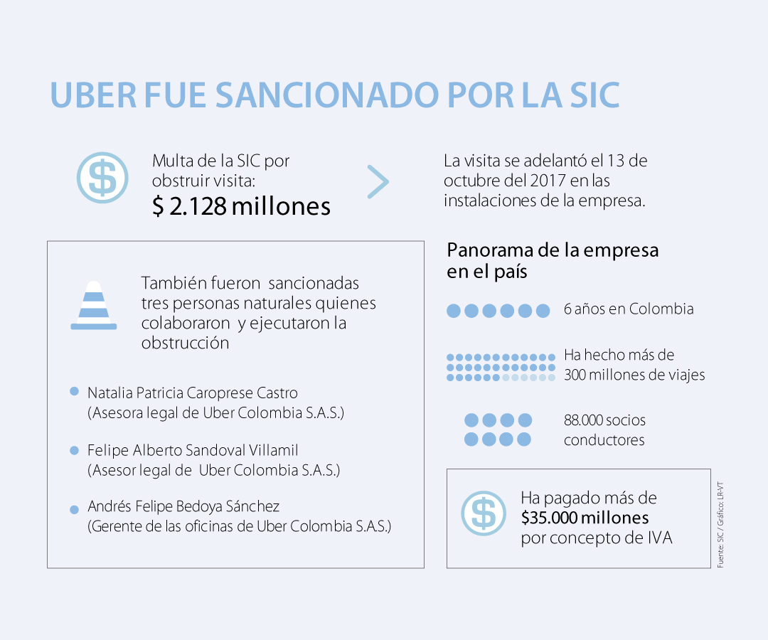 En el fallo, la SIC le ordenó a Uber cesar la utilización de contenido, acceso y prestación del servicio de transporte individual de pasajeros bajo las modalidades “Uber” “Uber X” y “Uber VAN”. Este ya era el tercer problema de Uber en la SIC solo en el segundo semestre del año pasado (en julio había recibido la orden de fortalecer su sistema de protección de datos personales y en agosto había sido multada por obstruir una visita administrativa que tuvo lugar en octubre de 2017). Además, un par de días antes la empresa había sido sancionada por la Supertransporte por incumplir la orden de no promocionar servicios no autorizados.
