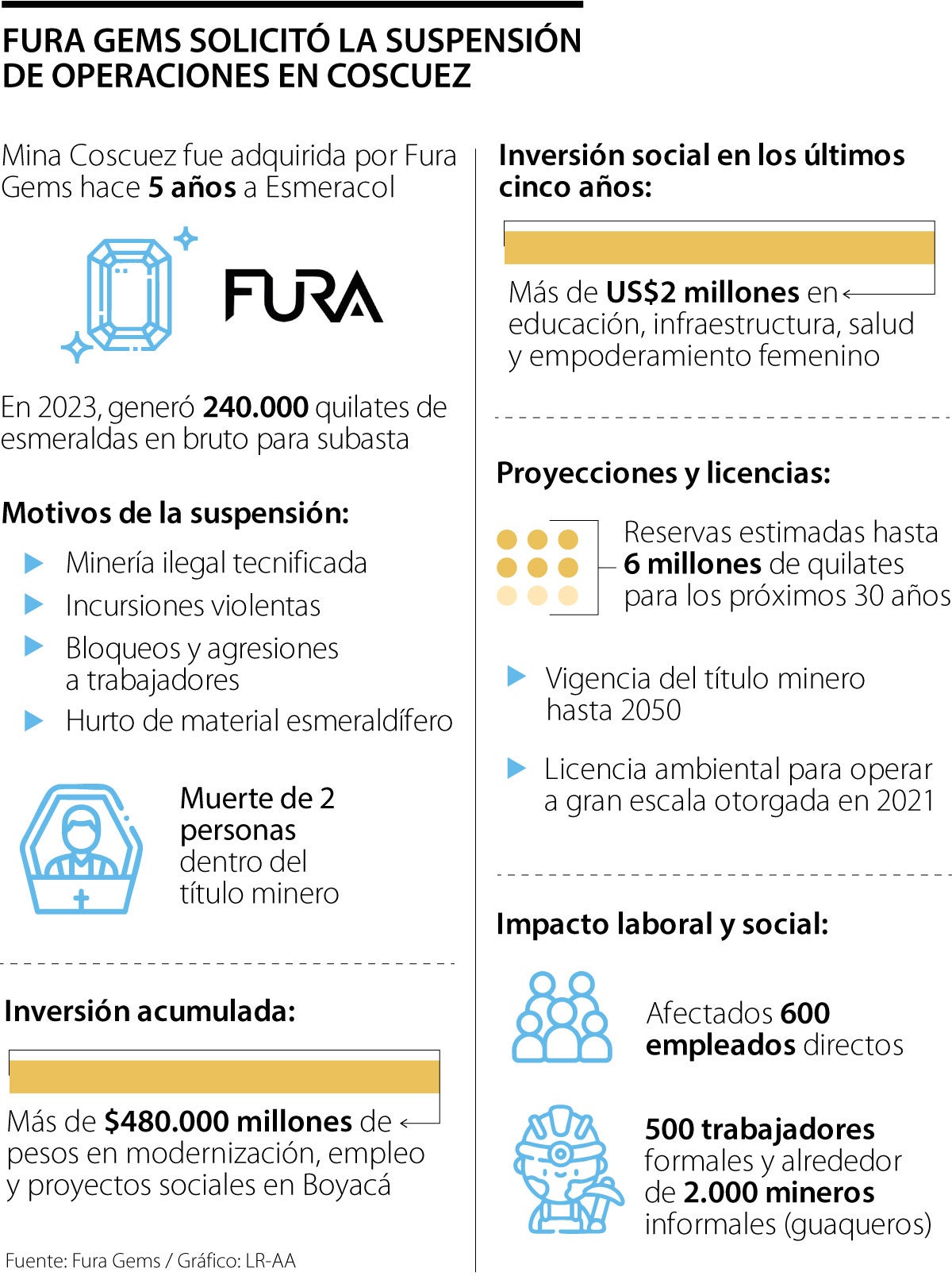 Fura Gems cofirmó este viernes que solicitó a las autoridades suspender las operaciones en su mina de Coscuez, ubicada en San Pablo de Borbur, Boyacá, un activo que adquirió hace cinco años de manos de Esmeracol y que, en 2023, generó producción para la subasta de 240.000 quilates de esmeraldas en bruto.