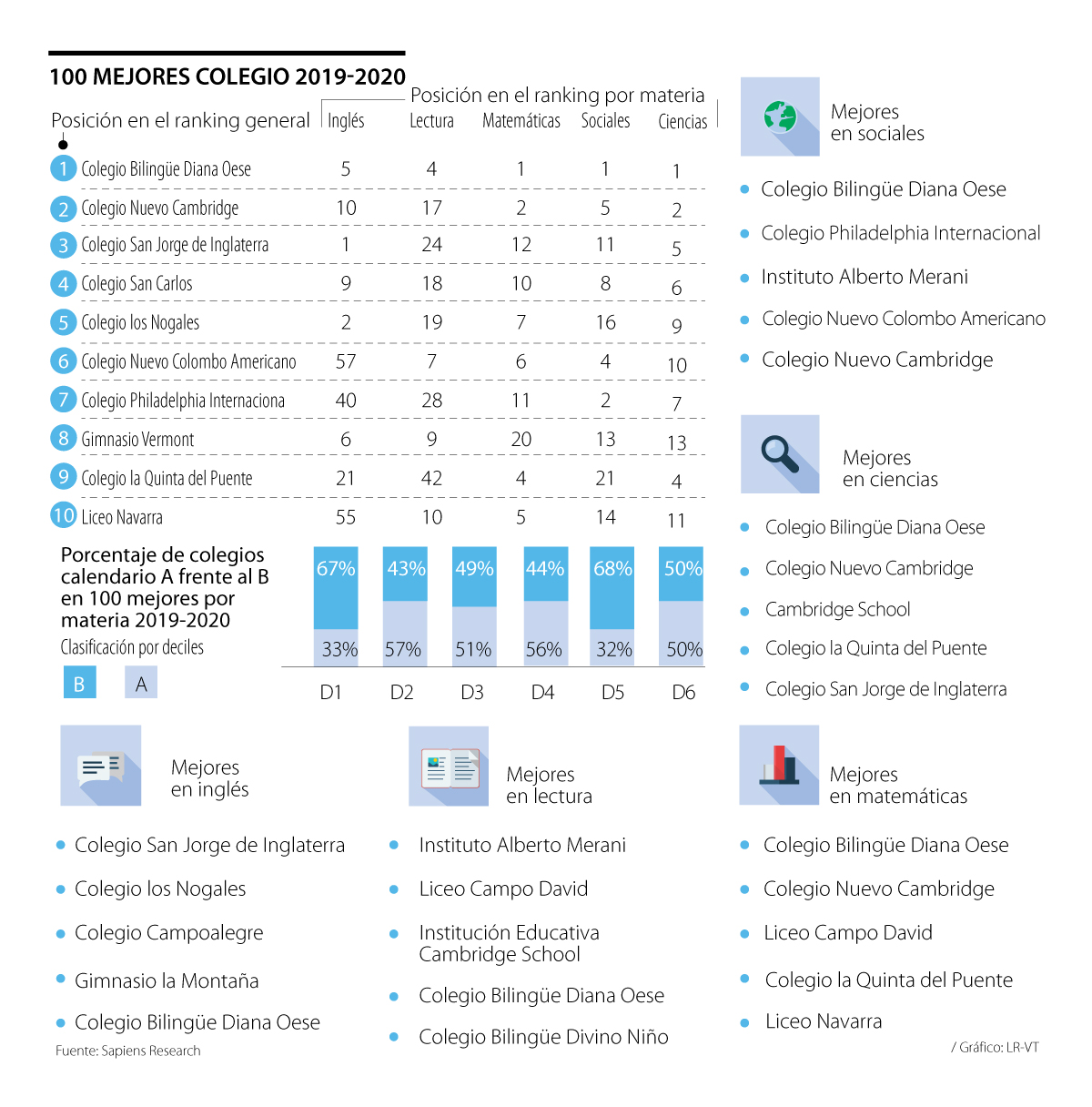 Sapiens Research publicó el ranking de los 100 mejores por materia 2019-2020, que fue liderado por el Colegio Bilingüe Diana Oese de Cali, que ocupó el primer puesto en matemáticas, sociales y ciencias; en lectura fue el cuarto y en inglés ocupó el quinto puesto. El segundo fue el Nuevo Cambridge, aunque no lideró en ninguna materia.