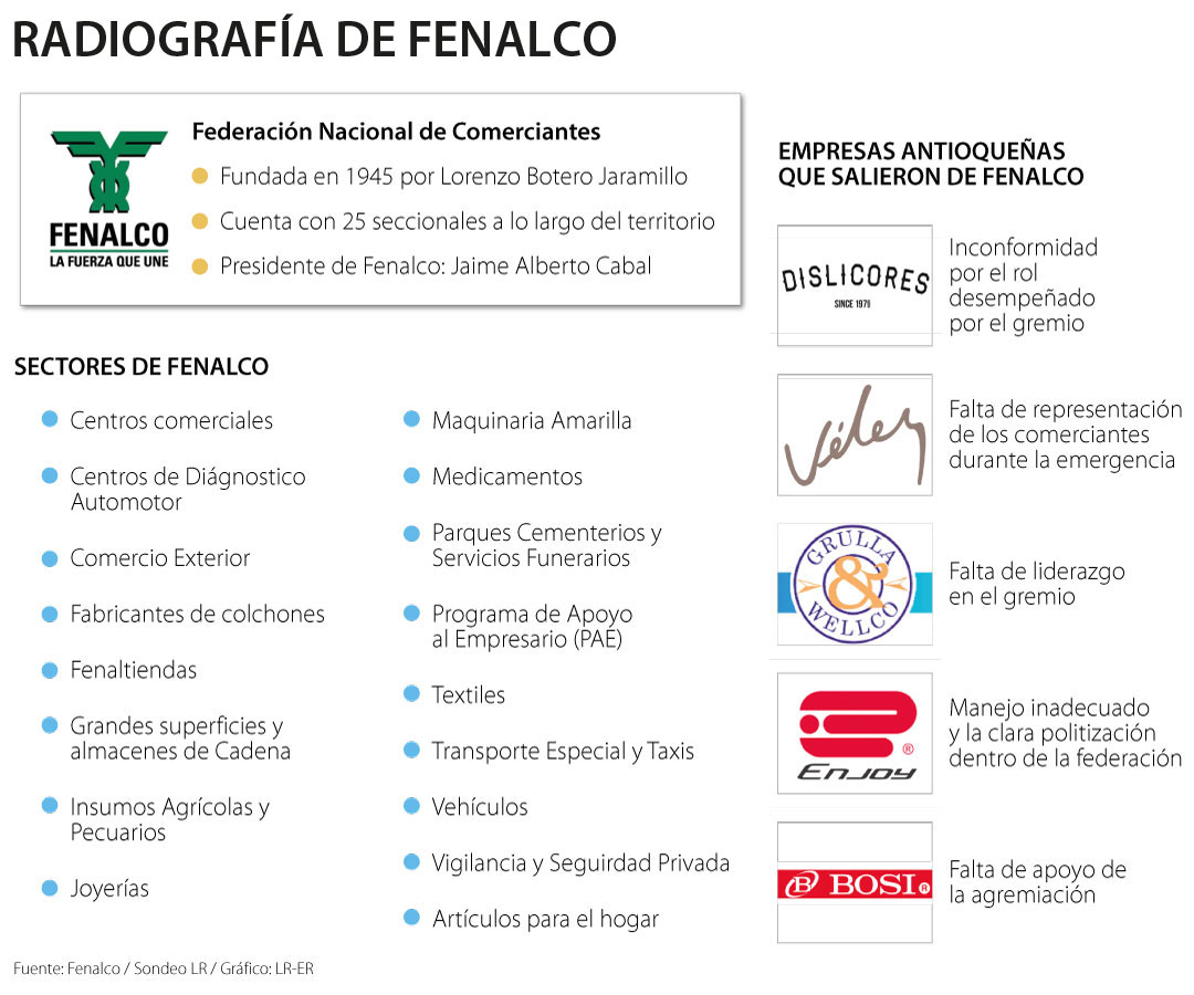 La Federación Nacional de Comerciantes (Fenalco) está atravesando uno de sus peores momentos luego de que Dislicores, Cueros Vélez, Grulla & Wellco (empresa dedicada a la distribución de calzado) Enjoy y Bosi lideraran la rebelión contra el gremio, tras anunciar su salida.
