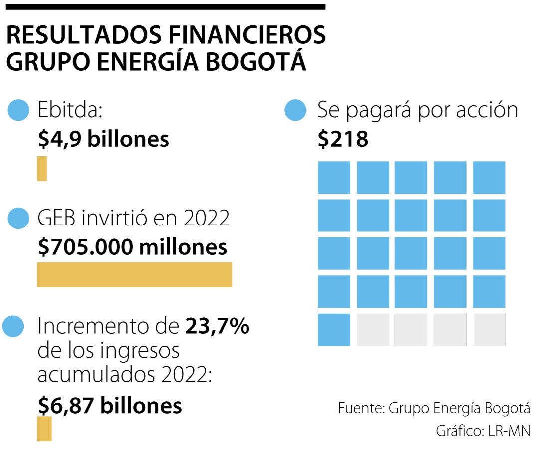 La Asamblea de Accionista de Grupo de Energía Bogotá (GEB)aprobó la distribución de $2 billones ($218 por acción) sobre las utilidades del año 2022. Durante la asamblea se reportaron los resultados financieros, en los que sobresalió el incremento de 23,7% en los ingresos acumulados de 2022, al pasar de $5,56 billones en 2021 a $6,87 billones el año pasado. Esto soportado en la distribución y transporte de gas natural y la transmisión de energía eléctrica en Colombia.