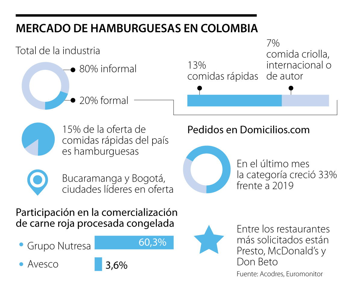 El origen de la hamburguesa es largo e incierto. Algunos dicen que se inventó en Estados Unidos, otros que en Alemania. Lo que sí es cierto es que ya es un plato mundial y en Colombia es uno de los preferidos. Según Euromonitor, el negocio de este producto en el país movió US$466,6 millones en 2019 y se espera tener ventas por US$523,3 millones en 2024.