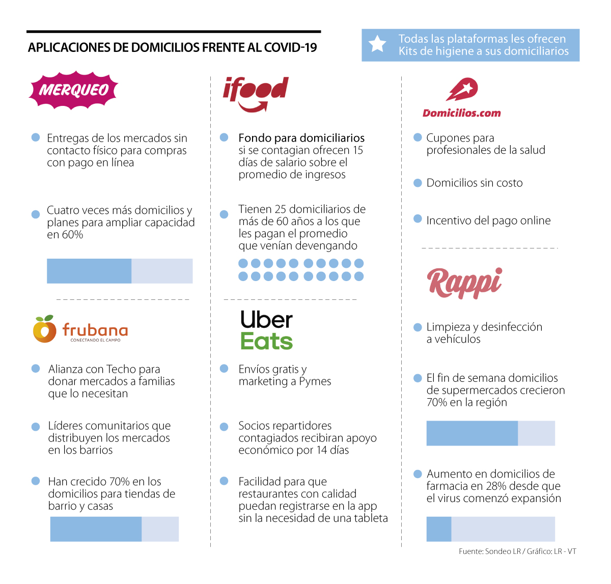 Uber Eats se ha centrado más en apoyar a los pequeños y medianos establecimientos independientes que se pueden ver afectados con el hecho de no recibir comensales y desarrollar su operación normalmente. Por esto han decidido no cobrarles los domicilios y ayudarles a generar estrategias de promoción que los ayuden con ingresos.