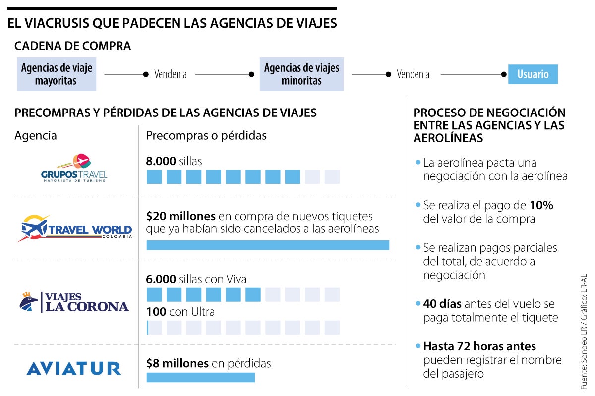 El problema aumenta con los repagos de tiquetes que han hecho las minoristas y la reducción de ventas. Ginna Cárdenas, gerente de Travel World Colombia, dijo que, por compras de nuevos pasajes, para responderles a clientes por los que ya habían pagado sillas a las ‘low cost’, han gastado $20 millones adicionales. ¿Quién responde? es la pregunta que se hacen. “Algunas mayoristas no apoyan a las minoristas, argumentan que los dineros fueron entregados a las aerolíneas y nosotros le ponemos la cara al cliente”, lamenta Cárdenas, quien agrega que, por un tiquete por el que se pagó aproximadamente $300.000, han tenido que invertir cerca de $400.000 más para reubicar a pasajeros en vuelos que tienen tarifas actuales que superan los $700.000