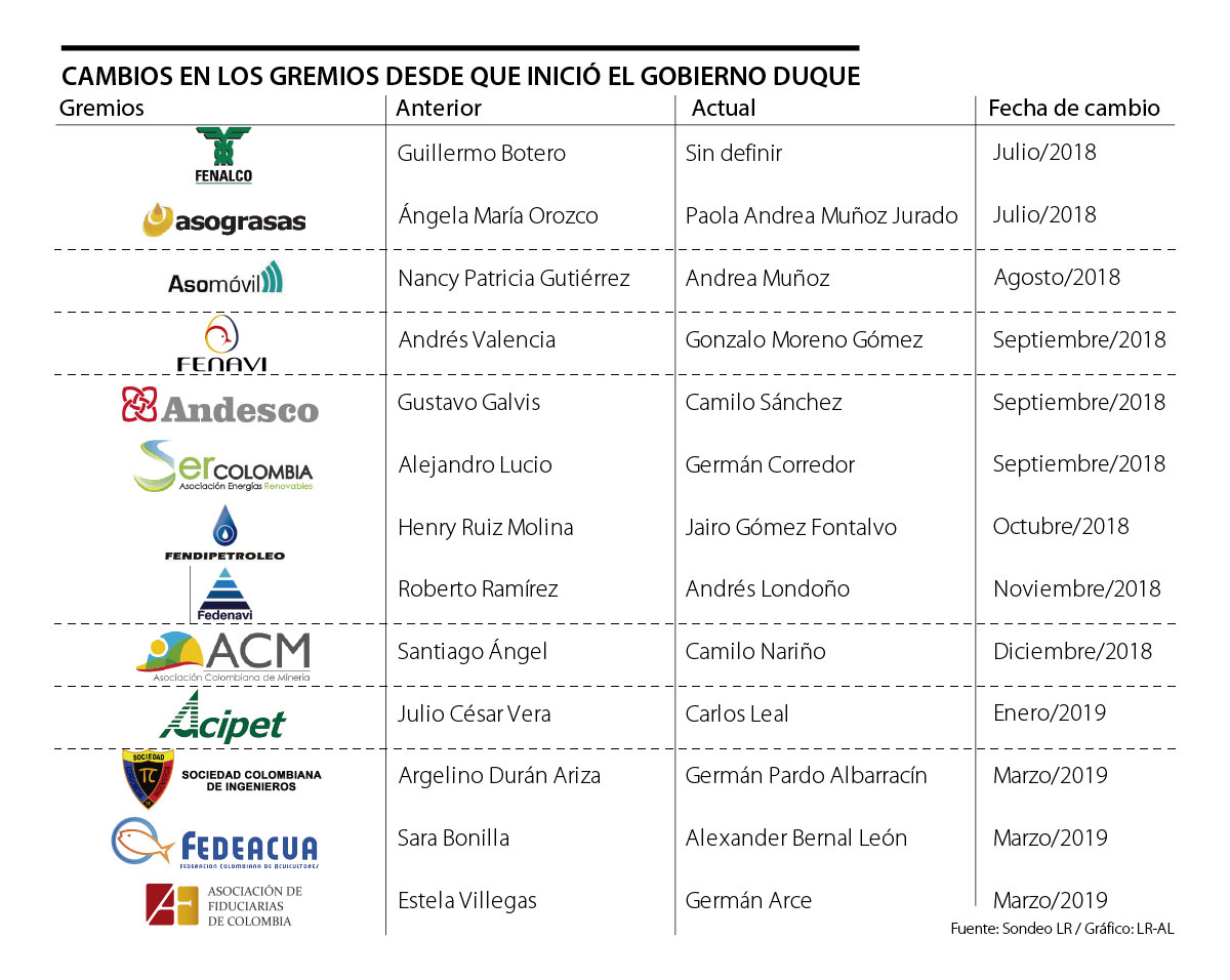 Las primeras movidas se vieron en julio, justo antes de que Duque se posesionara. Ese mes se dio la salida de Guillermo Botero de la Federación Nacional de Comerciantes (Fenalco) y de Ángela María Orozco de la Asociación Colombiana de la Industria de Grasas y Aceites Comestibles (Asograsas), quienes asumieron los ministerios de Defensa y Transporte, respectivamente.