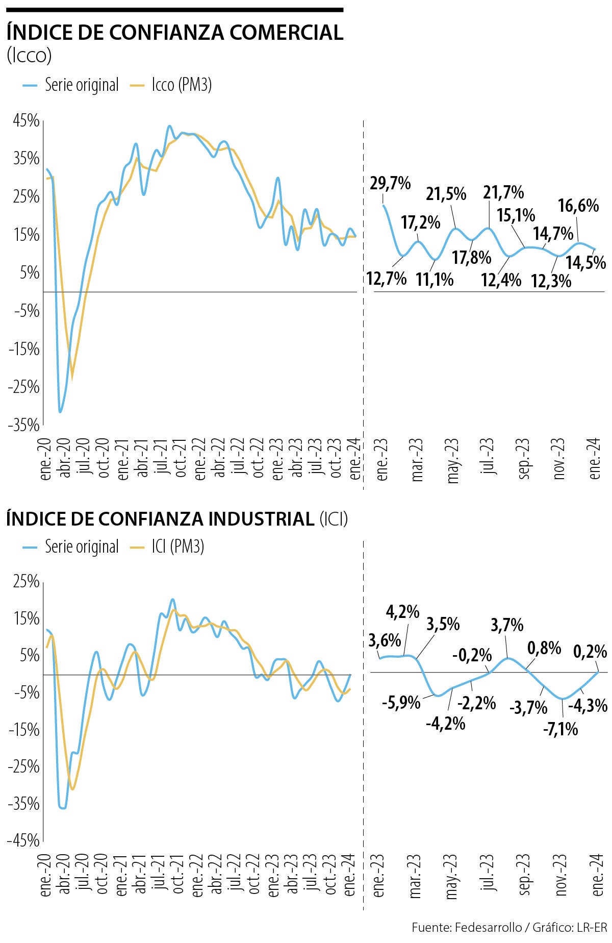 El Índice de Confianza Comercial elaborado por Fedesarrollo se ubicó en 14,5% en enero, lo que representa una disminución de 2,1 puntos porcentuales respecto a diciembre de 2023 (16,6%). El indicador tuvo una caída de 15,2 pps respecto al mismo mes de 2022, cuando se ubicó en 29,7%.