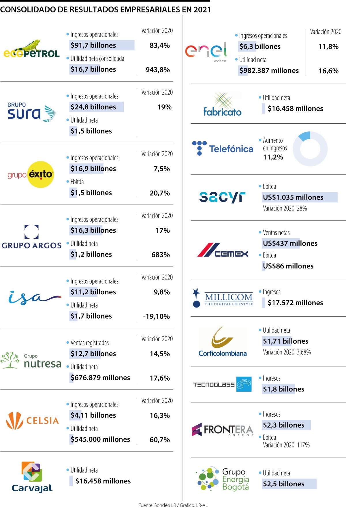 En el quinto lugar de las empresas que han reportado sus ingresos se encuentra Grupo Nutresa, que percibió $12,7 billones en ingresos operacionales, lo que es 14,5% más que 202o, y una utilidad neta de $676.879 millones (17,6%) con un ebitda de $1,5 billones (12%). En cuanto a los resultados financieros en Colombia, puntualmente la compañía registró ventas por el orden de $7,8 billones, lo que le significó un crecimiento de 16,3% frente a las del año anterior.
