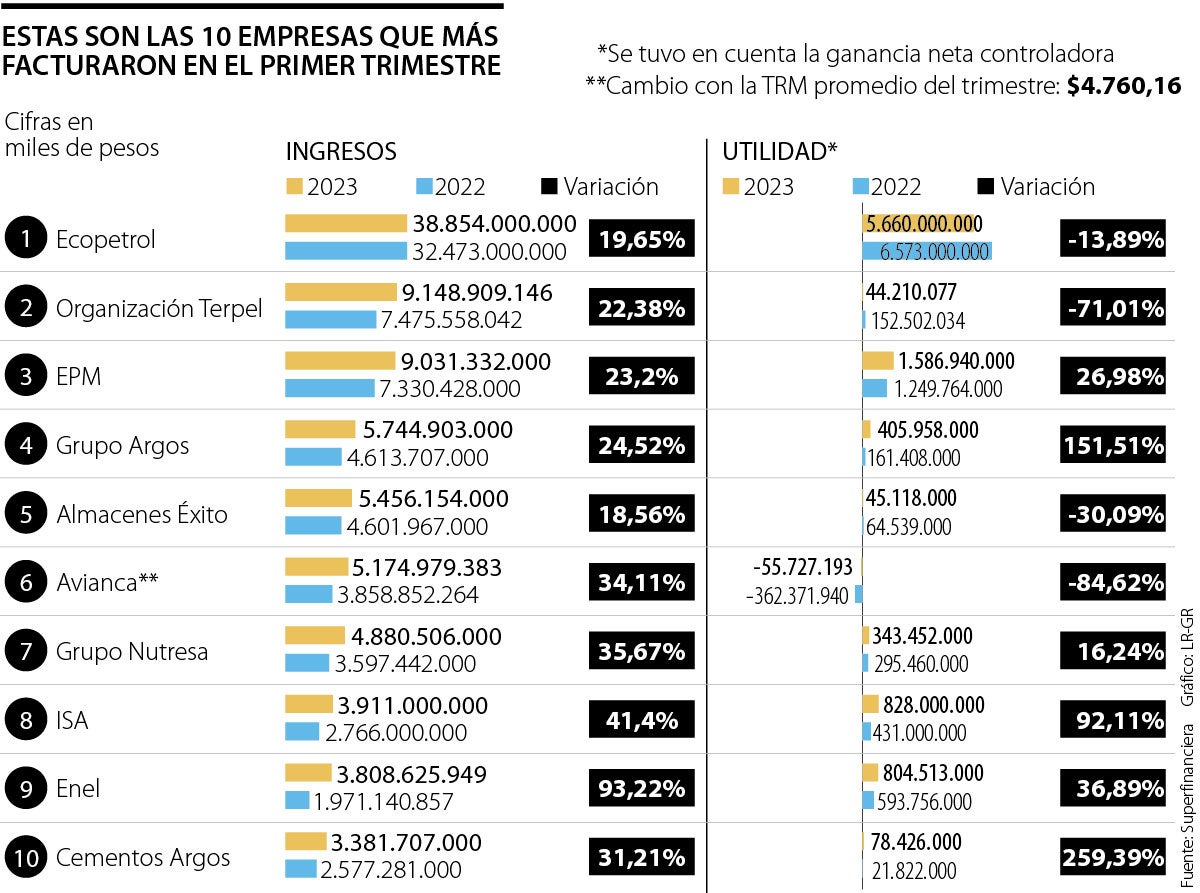 Al cierre de marzo, entre las compañías que reportan a la Superintendencia Financiera, hubo un total de ocho compañías que mostraron una caída en sus ingresos trimestrales, pero de resto todas crecieron respecto al mismo periodo de 2022. Ecopetrol, Terpel y EPM lideraron esta primera partida de resultados del año, con más de $57 billones de ventas en conjunto.