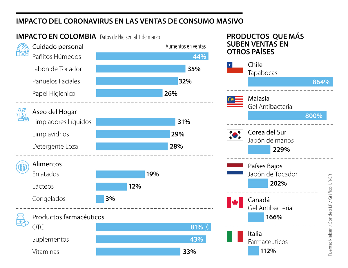 En el caso colombiano, por ejemplo, aunque para el cierre de la novena semana del año (febrero 24 a 1 de marzo) aún no se presentaba ningún caso confirmado de covid-19, Nielsen registró incrementos en el volumen de ventas en productos farmacéuticos, donde los OTC, aquellos que no necesitan autorización médica, aumentaron en 81%; los suplementos registran incrementos de 43%, y las vitaminas de 33%.
