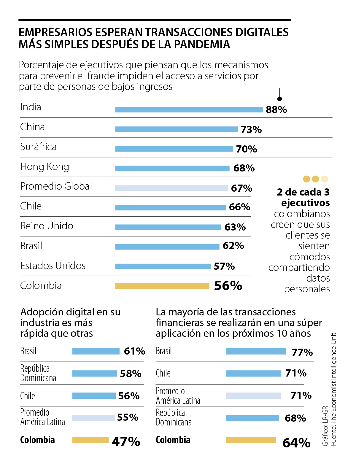 El estudio también mostró que 56% de los ejecutivos colombianos piensan que los mecanismos tradicionales para prevenir el fraude y reconocer identidades impiden el acceso a servicios de consumo de personas de bajos ingresos.