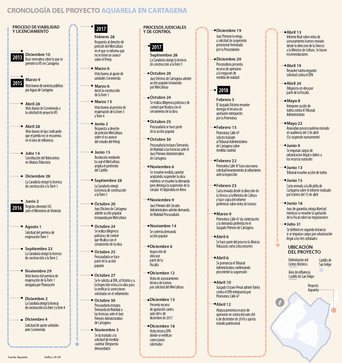 Aquarela, de hecho, recibió las licencias de construcción de sus cinco torres entre el 28 de diciembre de 2015 (la primera torre) y el 28 de septiembre de 2017 (la última torre), así como el visto bueno de varias entidades distritales: Aguas de Cartagena, la Corporación de Vivienda de Cartagena (Corvivienda) y el Instituto de Patrimonio y Cultura de Cartagena (Ipcc).