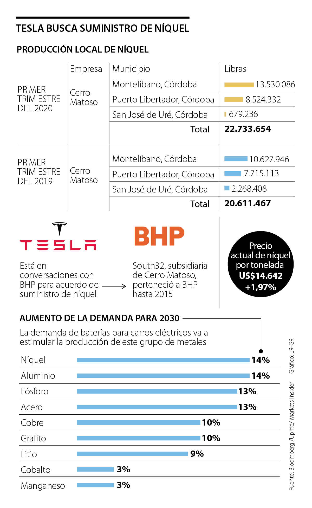 De llegarse a dar el acuerdo, la empresa necesitará más materia prima para cumplir con la demanda de Tesla, y una gran posibilidad es que como primera opción recurra a una de sus ‘hijas’ como South32, empresa cuya única mina de níquel está ubicada en el departamento de Córdoba y es operada por Cerro Matoso.
