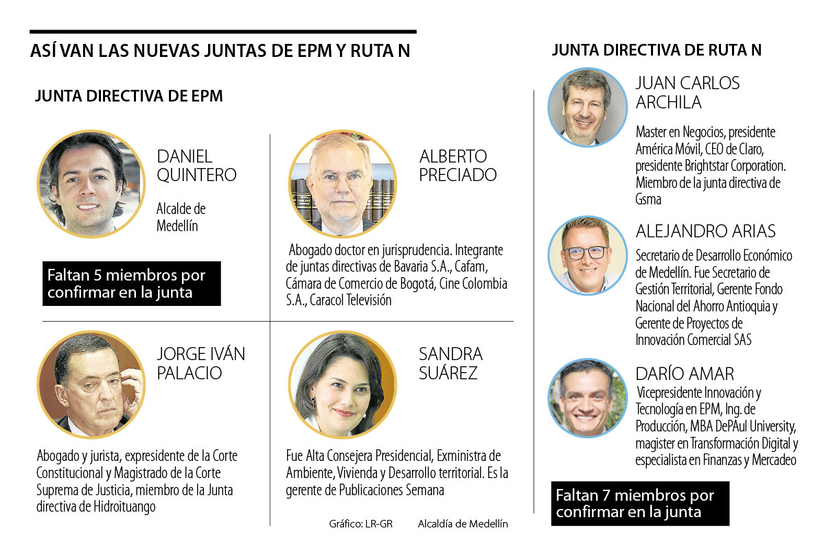 Por el lado de Ruta N renunciaron esta semana ocho miembros. La junta es precedida por Alejandro Arias, secretario de Desarrollo Económico de Medellín, quien fue ratificado ayer por Quintero, al igual que Darío Amar, vicepresidente Innovación y Tecnología en EPM. También se anunció otro nombre, Juan Carlos Archila, presidente América Móvil, CEO de Claro, y quien ostenta en su hoja de vida cargos como la presidencia de Brightstar Corporation y ser miembro de la junta directiva de la Asociación GSM. Al igual que en EPM, acá también se nota la intención de mover el tablero de la junta anterior, ya que Archila es un reemplazo del nivel y el sector de Marcelo Cataldo, CEO de Tigo, uno de los integrantes fijos de la junta que renunció esta semana.