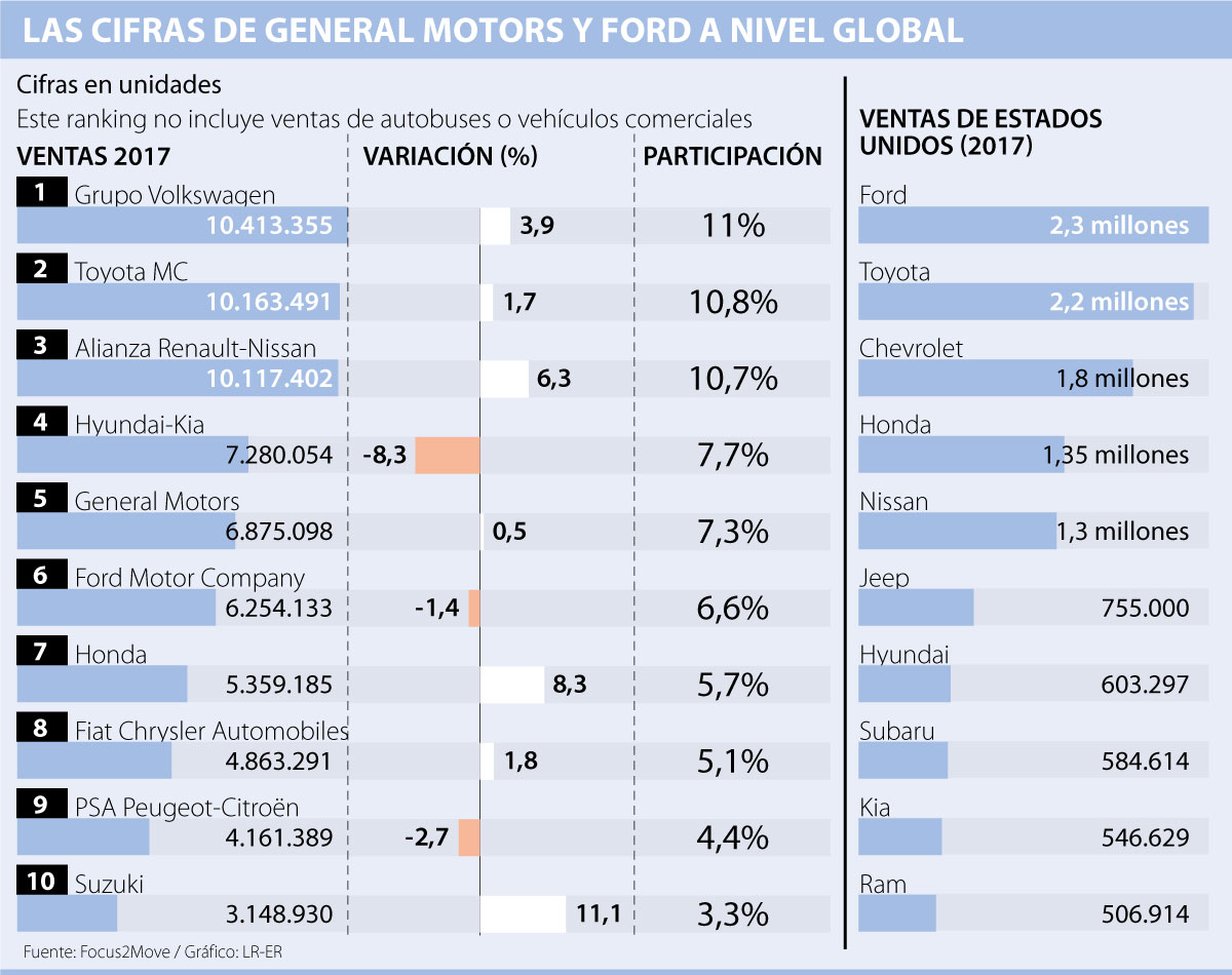 Las ventas mundiales de carros son el centro de la disputa para General Motors y Ford Motor Company, específicamente en la carrera que tienen por lograr una mejor posición en el ranking, pues a nivel internacional ambas vendieron el año pasado más de 6 millones de vehículos, ubicándolas en las casillas cinco (GM) y seis (Ford), con apenas una diferencia de algo más de 600.000 autos.