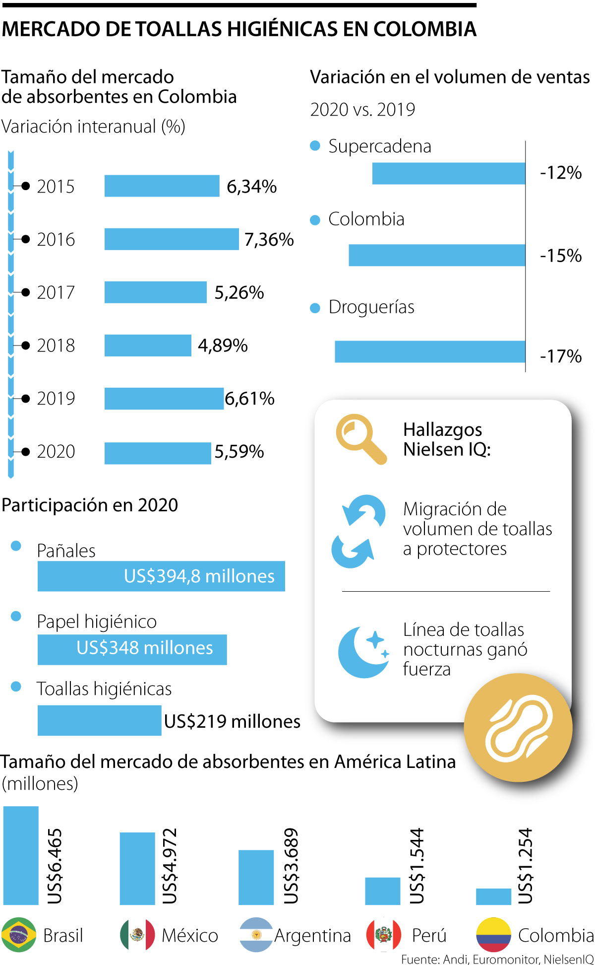 En total, y según recopila la Cámara de la Industria Cosmética y de Aseo de la Andi, el mercado de toallas higiénicas nacional alcanzó US$219 millones durante 2020; lo que representaría 9,3% menos que en 2019.