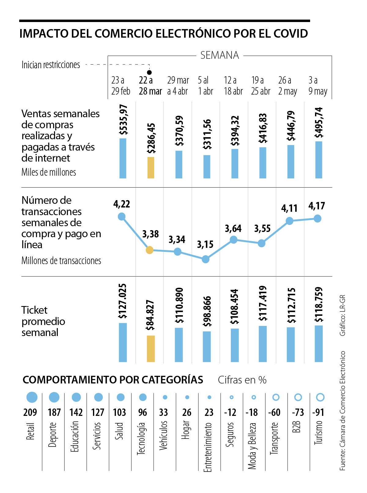 Entre el periodo del 23 al 29 de febrero, antes de las medidas restrictivas por covid, las ventas ascendían a $535.970 millones. Una vez se anunció la cuarentena en marzo, disminuyeron a $286.450 millones y en la semana entre el tres y nueve de mayo subieron $495.740 millones.