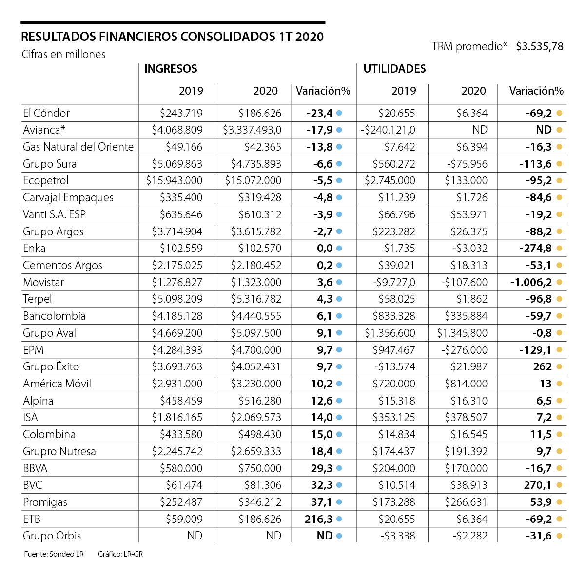 Avianca también está en esta lista de las que más redujeron sus ingresos con una contracción de 17,97%, pues el cierre de fronteras y el aislamiento como medida para enfrentar el covid-19 ha impactado principalmente a las aerolíneas, sin contar que la compañía ya venía en un proceso de debilitación económica, que se devela en la cifra que pasó de $ 4,06 billones en facturación a $ 3,33 billones en el primer trimestre de este año.