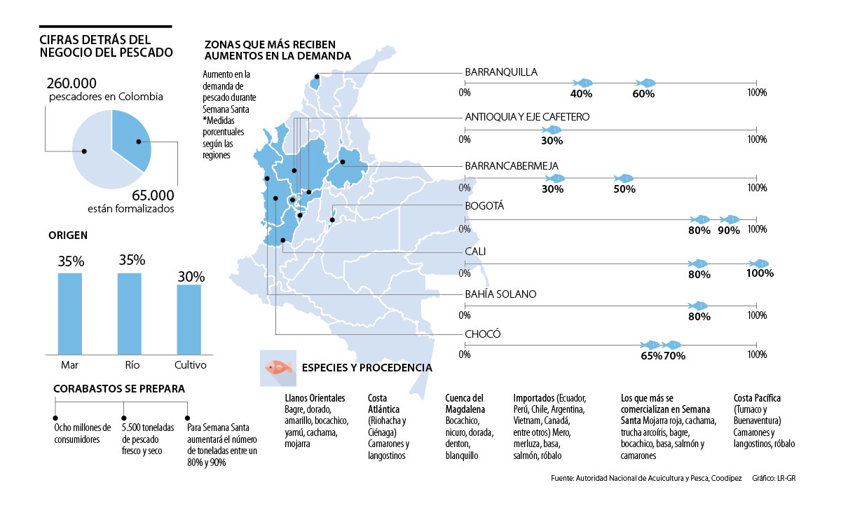 “La Semana Santa es la mejor época para este producto, por lo que las ventas se aumentan hasta 40% en nuestro caso. En algunos otros casi se duplica el consumo de pescado nacional en este momento del año”, aseguró Felipe Cardozo, gerente general de Hipermarfish, quien además dijo que el consumo per cápita en Colombia es solo de ocho kilos por persona al año con base en cifras de Aunap.