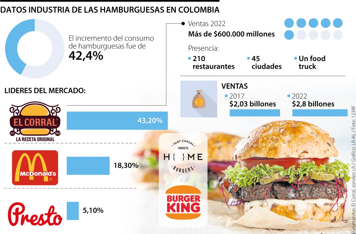 Este consumo ha venido aumentando significativamente en los últimos cinco años con un incremento de 42,4% desde 2017. Esto quiere decir que cada año el consumo de este mercado ha venido creciendo alrededor de 8% anual. Las ganancias aumentaron 40% en ese mismo periodo de tiempo, pasando de $2,02 billones en 2017 a $2,8 billones con corte al año pasado. En esta industria lideran el Grupo Nutresa con El Corral, con una participación de 43,2%.