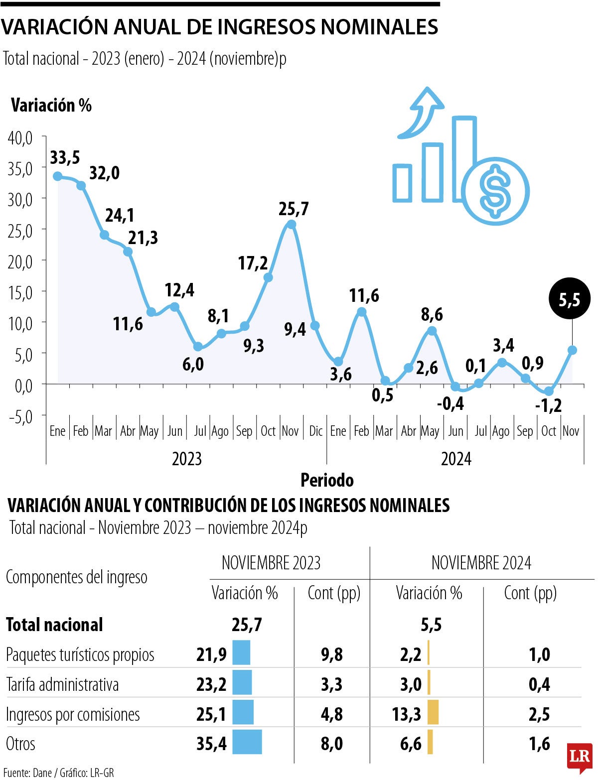 De acuerdo con la encuesta mensual de agencias de viajes realizada por el Dane, el crecimiento de los ingresos nominales de estas empresas en noviembre de 2024 fue de 5,5%, es decir, 20 puntos porcentuales más bajo que la variación de 25,7% del año pasado.