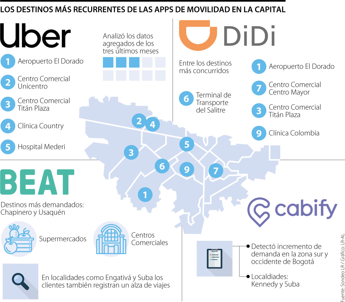 Así, entre las zonas más comunes a donde viajan los clientes de aplicaciones como Uber, DiDi y Beat, se destacan: el Aeropuerto El Dorado, centros comerciales clínicas y hospitales.