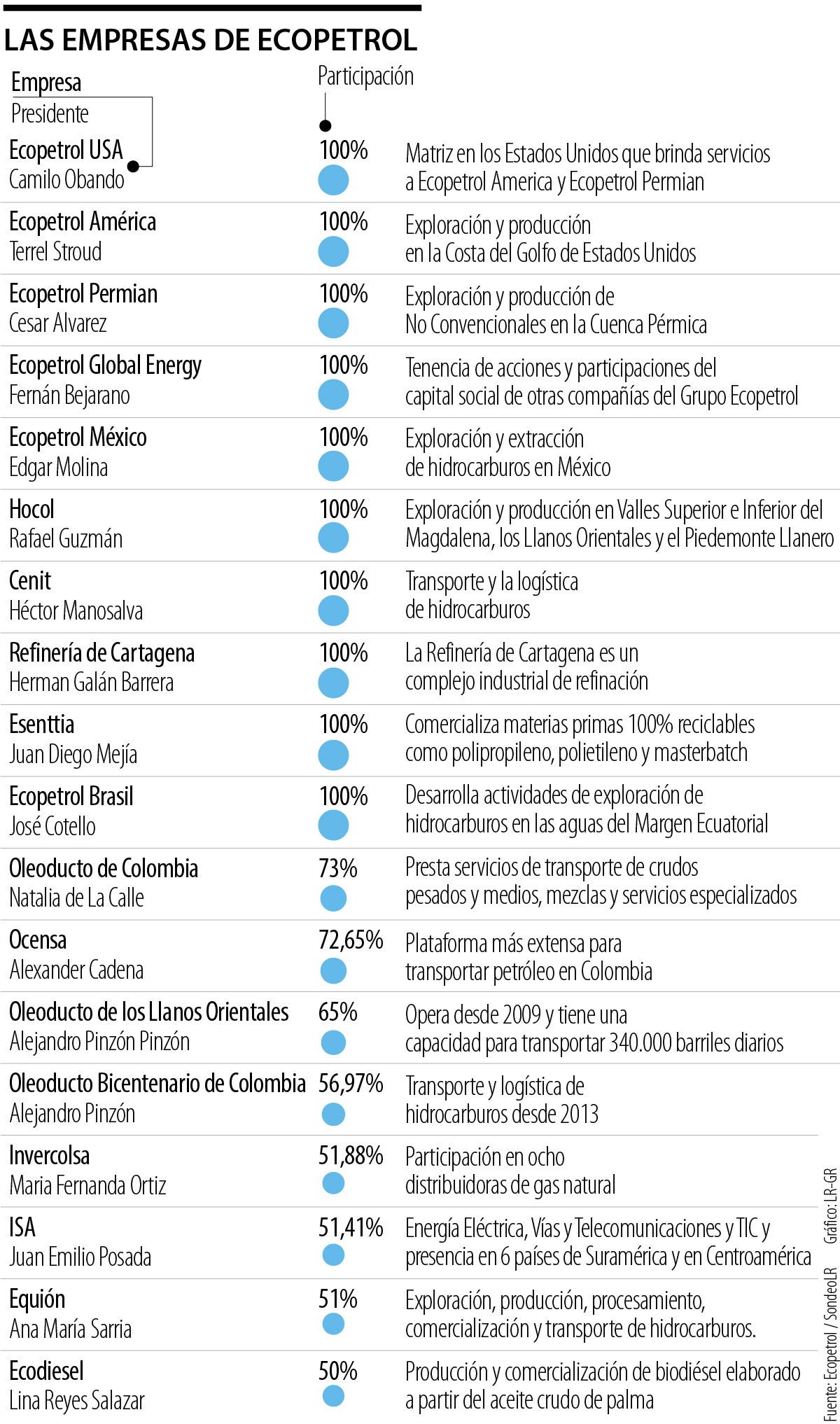 Al menos 18 empresas estarían en el ojo del huracán. Allí destacan Ecopetrol USA, que está bajo la dirección de Camilo Obando. Él lleva más de dos años en el cargo y 22 años en la compañía liderando equipos de la parte comercial. Otra de las filiales es Ecopetrol Globall Energy, presidida por Fernán Bejarano, quien lleva cerca de nueve años a la cabeza de la compañía. Bejarano cuenta con amplia experiencia en derecho público, fiscal, económico, financiero y corporativo.