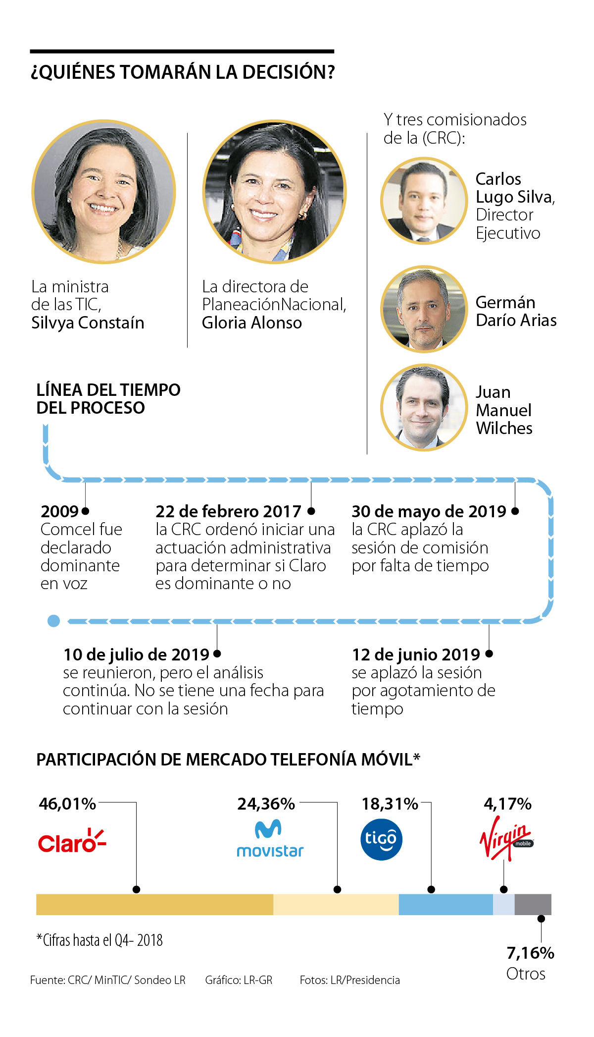 Los operadores móviles y sus usuarios tendrán que seguir esperando a que los comisionados de la Comisión de Regulación de Comunicaciones (CRC), la ministra de las TIC, Sylvia Constain, y la directora del Departamento Nacional de Planeación, Gloria Alonso, se pronuncien y determinen si Claro tiene o no una posición dominante en Colombia.