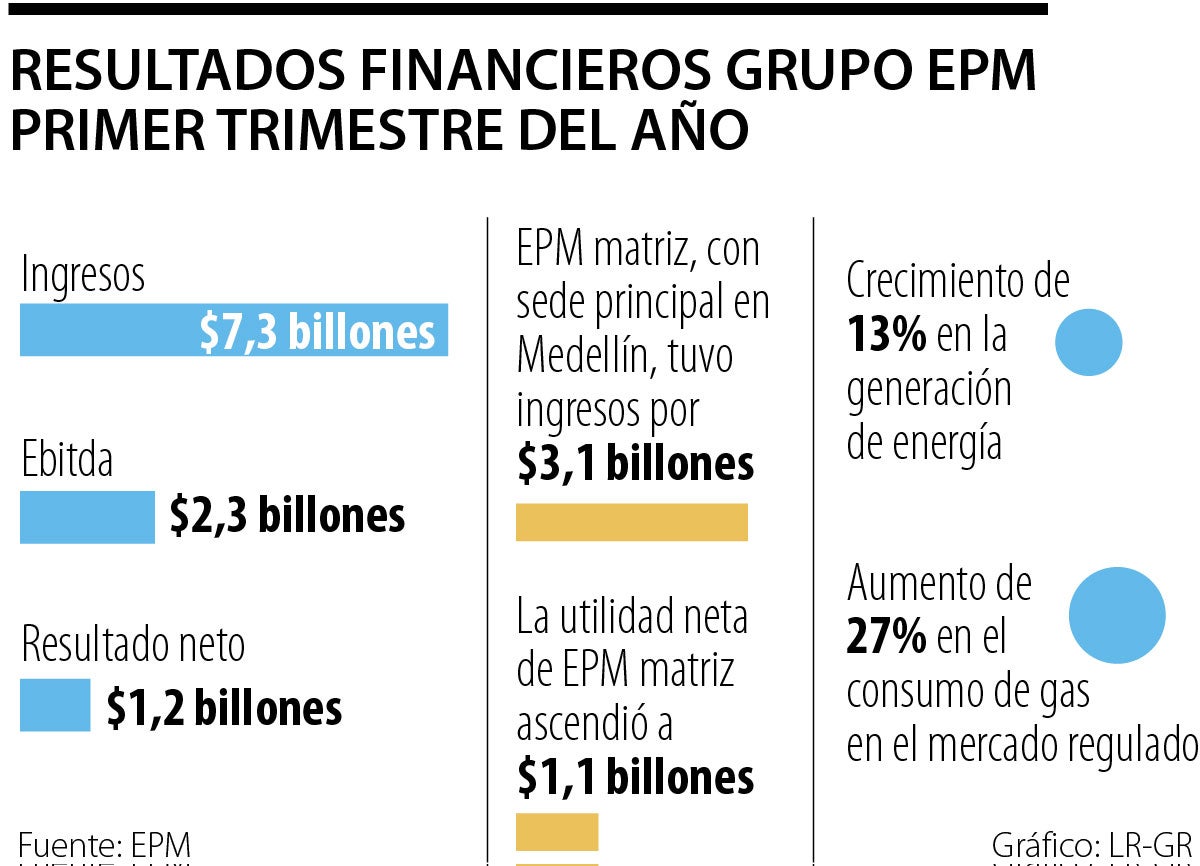 El Grupo EPM dio conocer sus resultados financieros para el primer trimestre del año, cuando logró un crecimiento de 31% en sus ingresos, que ascendieron a $7,3 billones. El Ebitda fue de $2,3 billones, con un incremento de 33% y el resultado neto alcanzó $1,2 billones, con un aumento de 46% en comparación con el mismo período de 2021. Energía eléctrica, gas y agua fueron los servicios más demandados