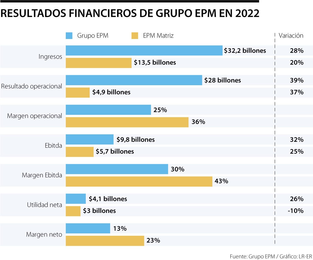 El Grupo EPM obtuvo $32,2 billones en ingresos en 2022, lo que representa un incremento de 28% frente a 2021 y un Ebtida de $9,8 billones. La compañía obtuvo un resultado operacional de $28 billones, es decir, 39% más frente al año anterior. La utilidad neta fue de $4,1 billones.