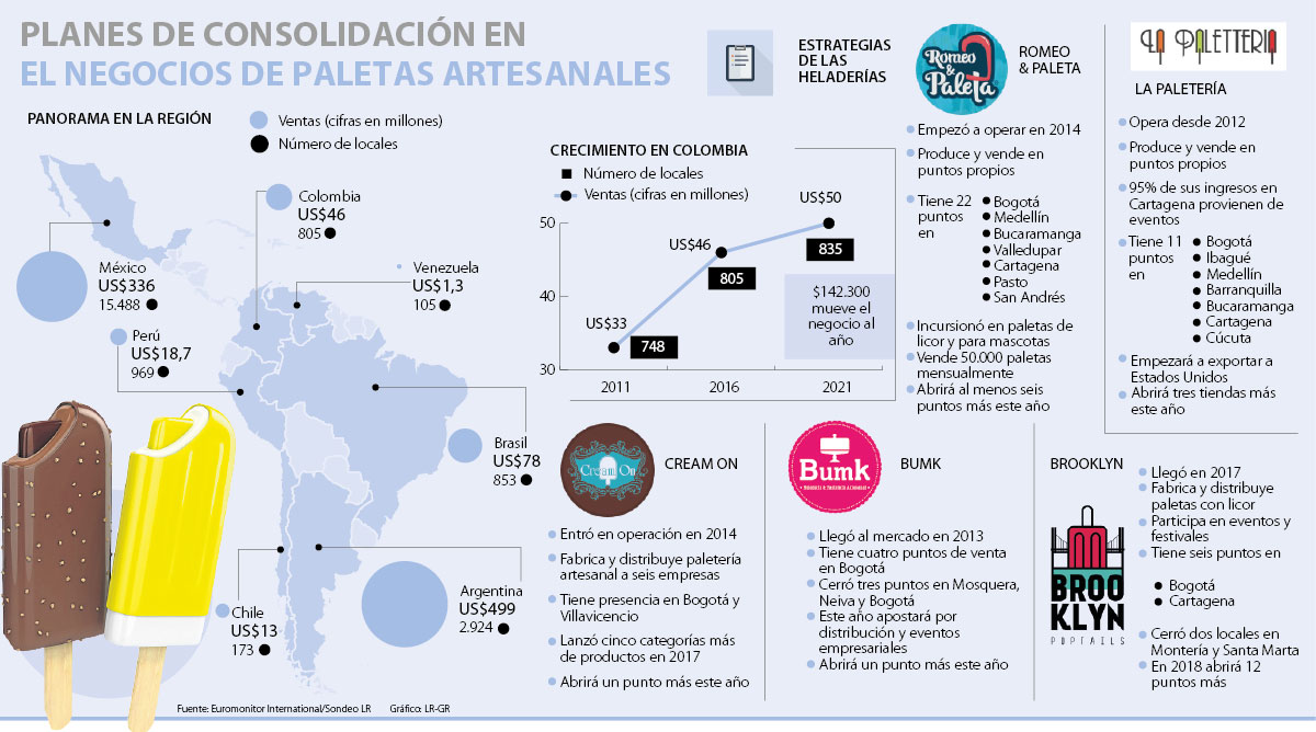 “Gran parte de nuestra idea fue buscar una forma diferente de presentar un producto tradicional de forma llamativa. En Bogotá fuimos los primeros y, sin duda, hubo un boom entre 2014 y 2016, cuando se pusieron en marcha varias marcas. Sin embargo, todavía no se ha acabado el negocio y nuestras ventas y clientes se mantienen”, explicó Felipe Acosta, gerente general de Romeo & Paleta.