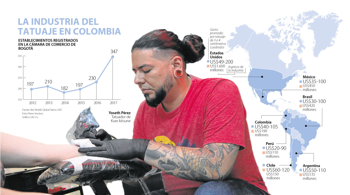 En América del Norte la tasa de crecimiento del negocio es de 6% anual, y en América Latina hasta 10%. Colombia está dentro de los mejores mercados, expresó Yoset Pérez, uno de los mejores tatuadores de Venezuela que ya lleva tres años en Colombia con su estudio Kure Kitsune al norte de Bogotá.
