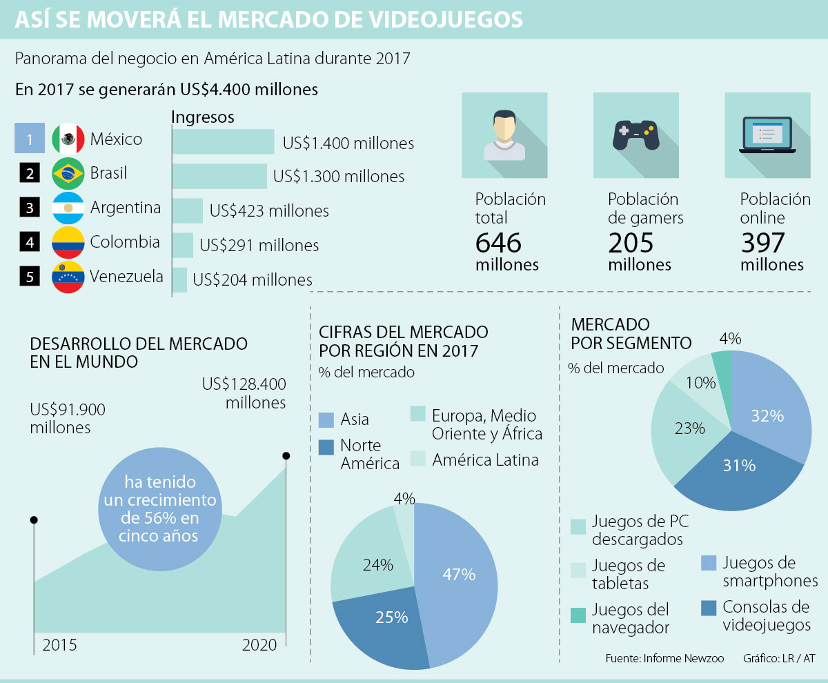 A nivel mundial América Latina aún no alcanza una cifra importante, comparada con el resto del mundo, ya que según el informe de Newzoo, Asia tiene el liderato con 47% del mercado mundial e ingresos por US$51.200 millones en la industria.