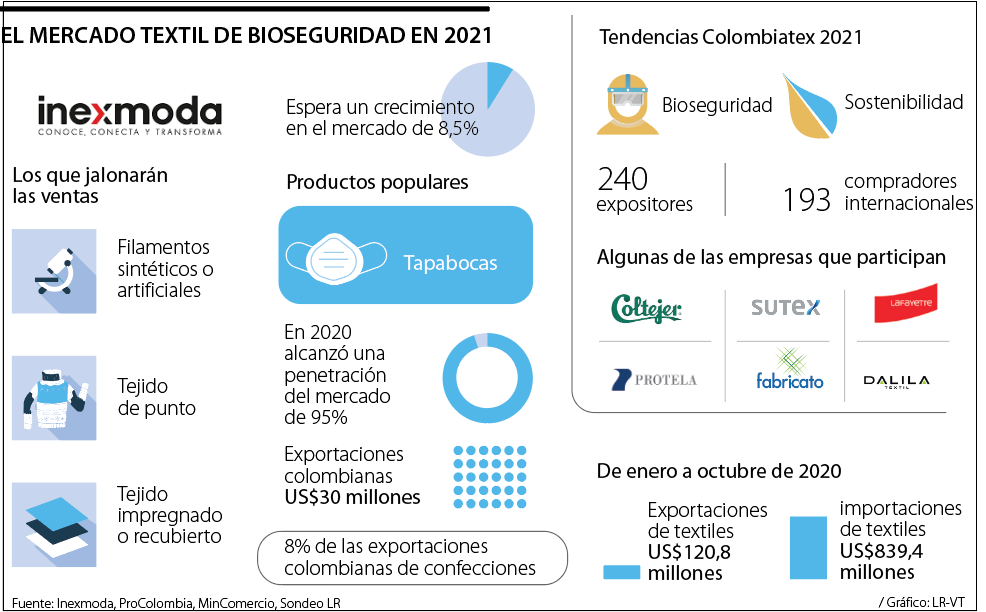 La emblemática feria del sector textil, Colombiatex, completa su tercer día, y una de las tendencias que ha resaltado para 2021 es la de textiles y confecciones relacionadas con la bioseguridad, en la que varias empresas ya han incursionado.