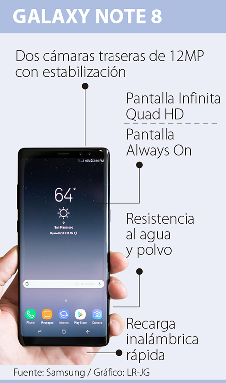 Se trata del Samsung Galaxy Note 8 que tiene como principales características una pantalla Quad HD+ Súper AmoLED de 6,3 pulgadas que cumple la tarea de pantalla infinita y la posibilidad de personalizar aplicaciones en el panel de borde.