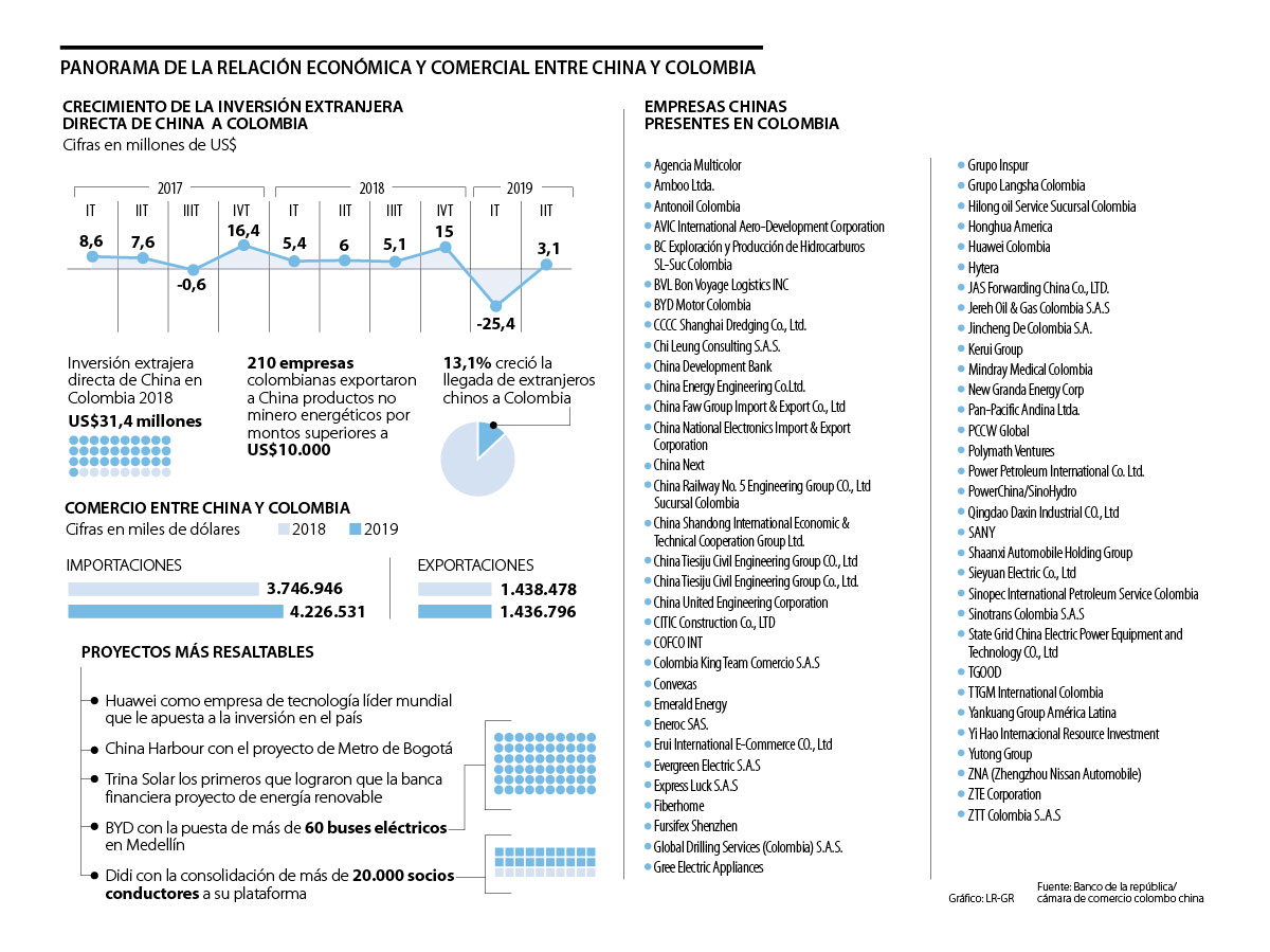 Según cifras del Banco de la República, para 2018 se recibió en inversión directa más de US$31,5 millones desde China, lo que evidencia un voto de confianza del sector privado de ese país en Colombia.