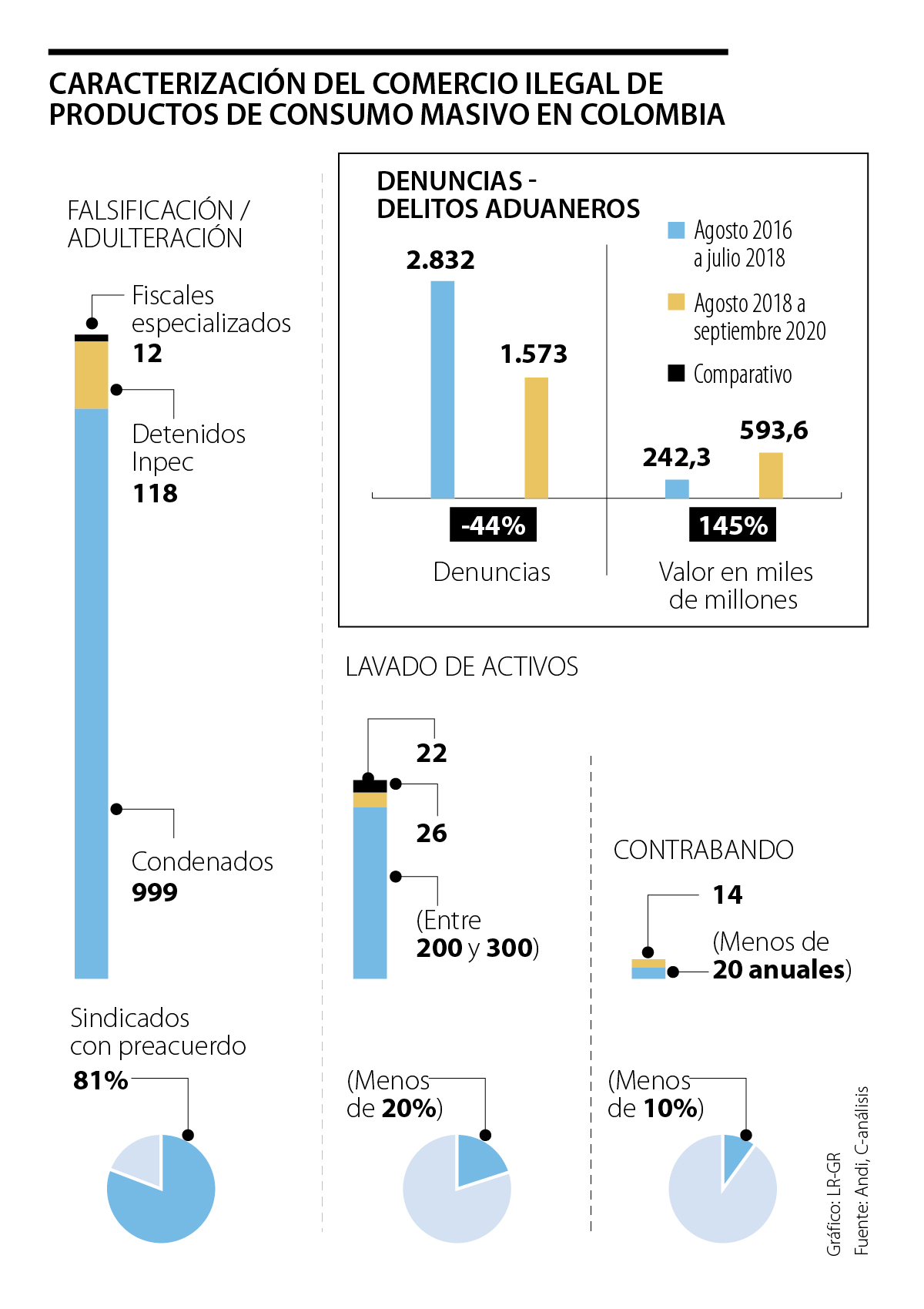 De acuerdo con el estudio, los sindicados con preacuerdo por delitos de falsificación equivalen a 81%, mientras que en lavado de activos es menos de 20% y en contrabando, 10%. “Con el estudio estamos abriendo hacia un escenario que no conocemos”, dijo Rico.