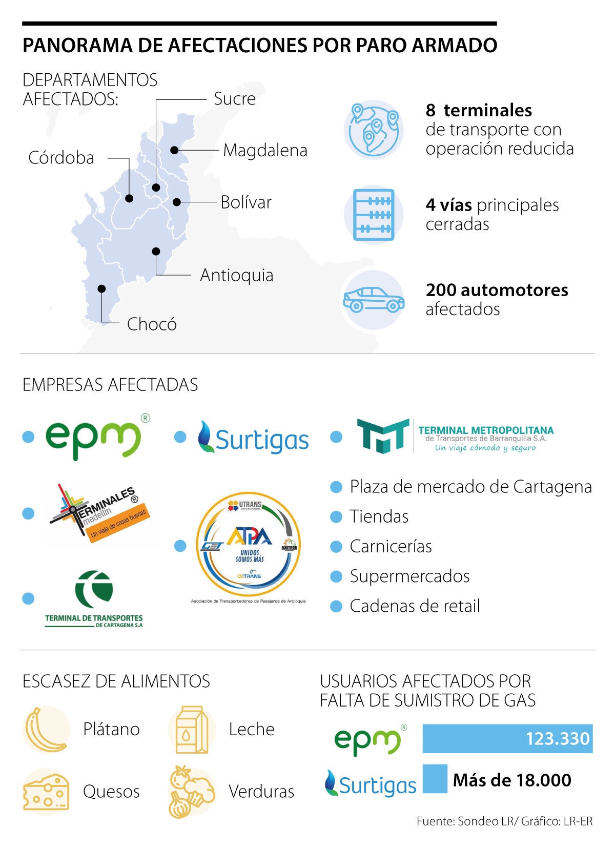 En el sector transporte la situación se ha tornado dramática. La movilización de carga y pasajeros ha estado restringida en las terminales de los municipios donde este grupo ha realizado hostigamientos. Según datos del Ministerio de Defensa, hay ocho terminales de transporte con operación reducida, cuatro vías principales cerradas y 200 automotores afectados.