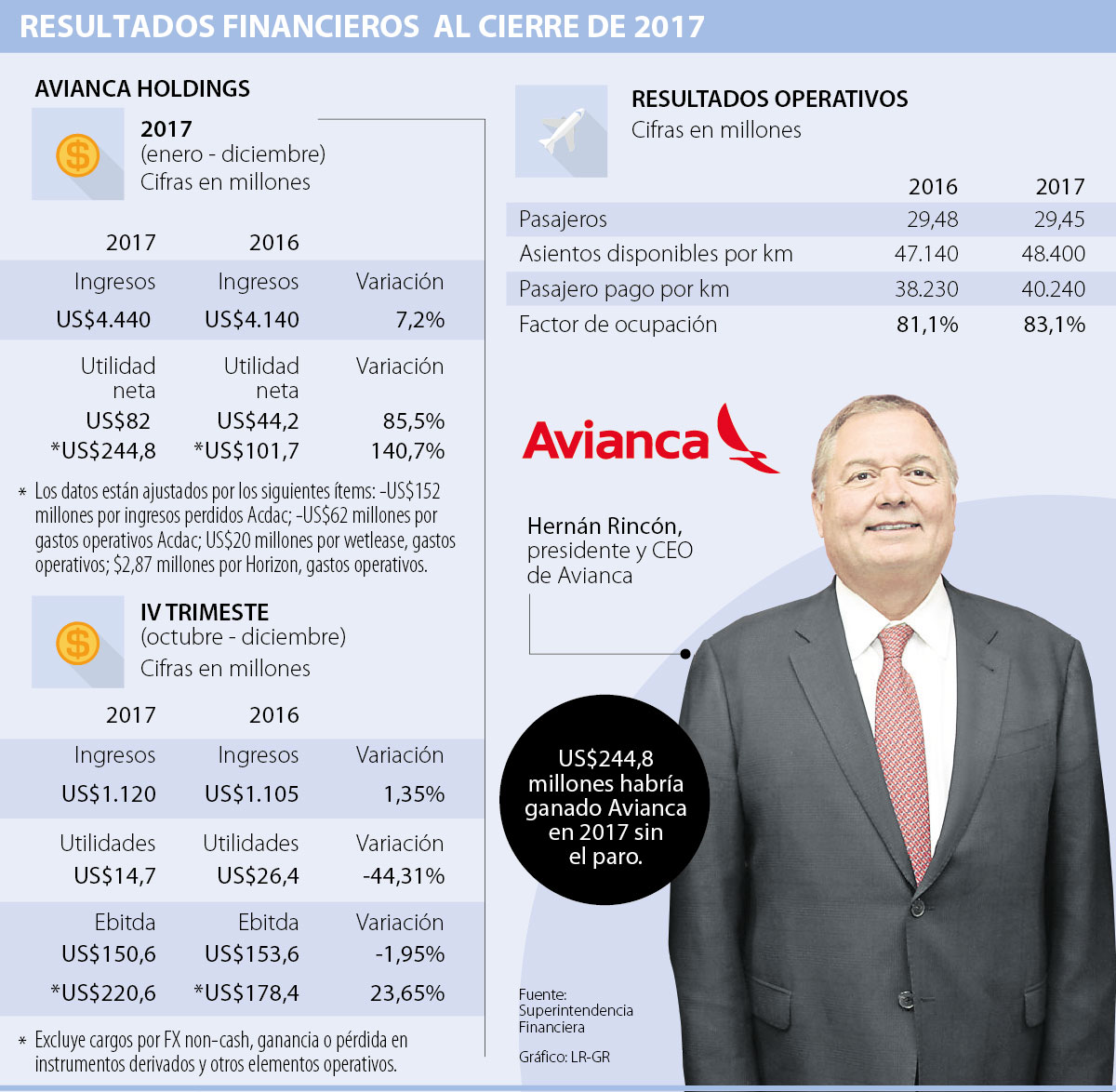 Las utilidades del grupo también se deterioraron con el paro, pues de acuerdo con las expectativas de Avianca, la cifra debió llegar a US$244,8 millones en el que hubiera sido el mejor año de la compañía. Sin embargo, el cese de actividades hizo que, al cierre, la holding reportara que ganó US$84 millones en el año y solo US$14,7 millones en los últimos tres meses de 2017.
